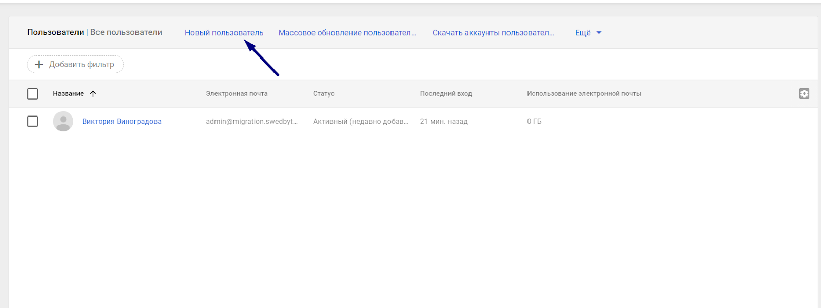 Прежде чем начать миграцию, необходимо в Google Workspace создать аккаунты пользователей, куда собственно будет происходить миграция данных. Процесс достаточно простой и осуществляется в разделе Пользователи в консоли администратора.