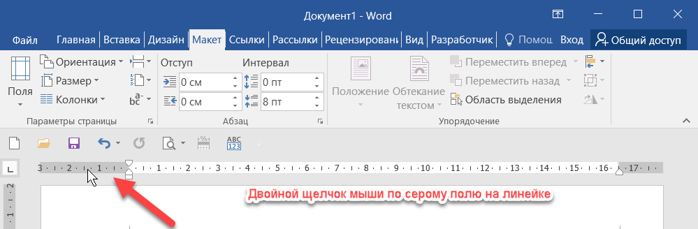 1. В окне открытого документа дважды щелкаем по горизонтальной линейке в области полей документа.