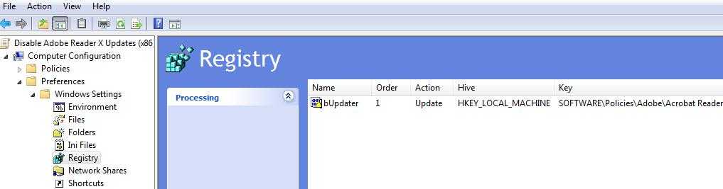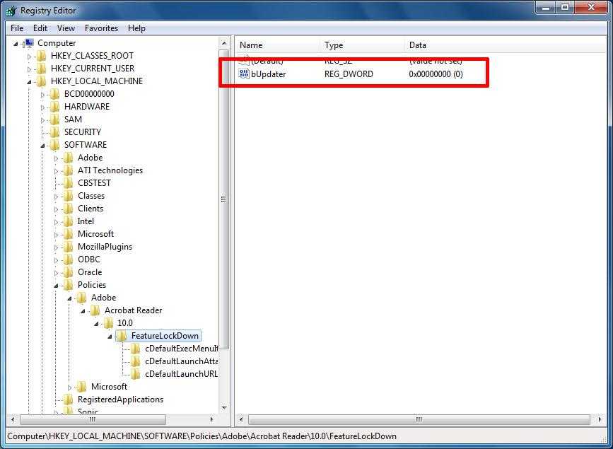 Action: UpdateHive: HKEY_LOCAL_MACHINEKey Path: SOFTWARE\Policies\Adobe\Acrobat Reader\10.0\FeatureLockDown (для x64-битной ОС, ключ другой, см. выше)Value name: bUpdaterValue type: REG_DWORDValue data: 00000000 Base: Hexadecimal