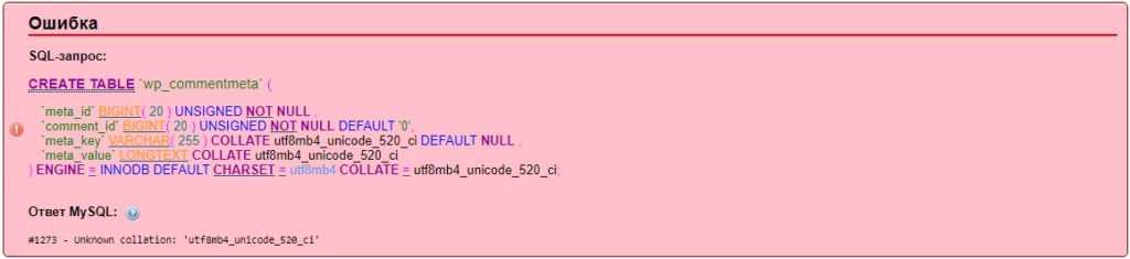Ошибка SQL-запрос: CREATE TABLE `wp_commentmeta` ( `meta_id` BIGINT( 20 ) UNSIGNED NOT NULL , `comment_id` BIGINT( 20 ) UNSIGNED NOT NULL DEFAULT '0', `meta_key` VARCHAR( 255 ) COLLATE utf8mb4_unicode_520_ci DEFAULT NULL , `meta_value` LONGTEXT COLLATE utf8mb4_unicode_520_ci ) ENGINE = INNODB DEFAULT CHARSET = utf8mb4 COLLATE = utf8mb4_unicode_520_ci; Ответ MySQL: Документация #1273 - Unknown collation: 'utf8mb4_unicode_520_ci'