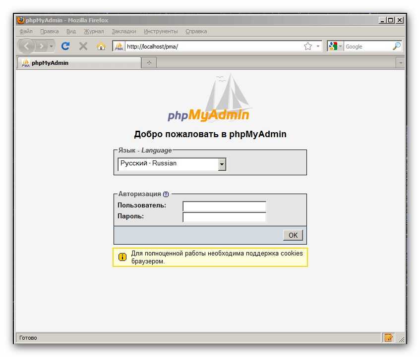 Для того, чтобы попасть в программу phpMyAdmin, входящую в комплект сборки локального сервера, нужно набрать в адресной строке вашего браузера следующий Урл: