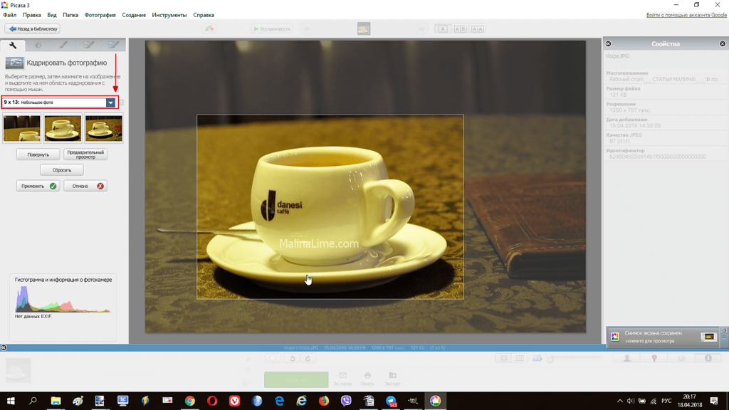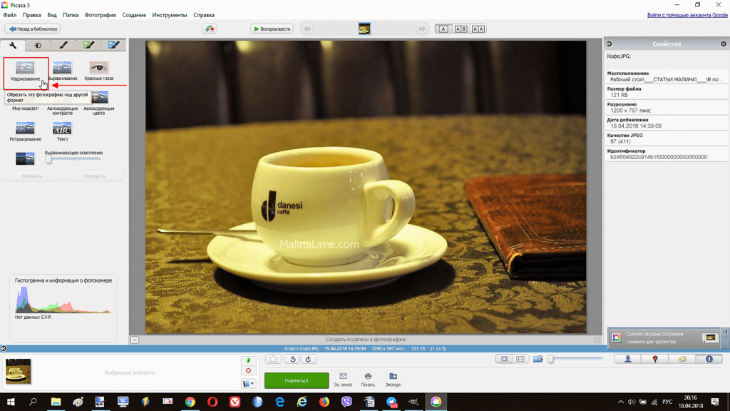 Открыть изображение для кадрирования в Picasa