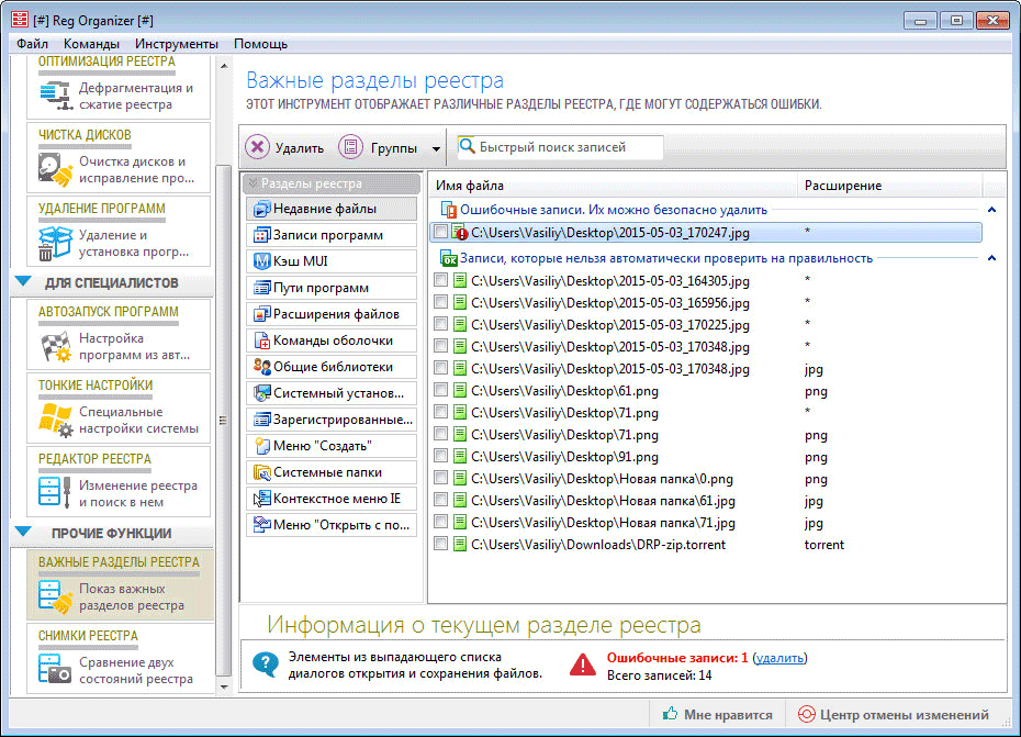 В окне «Важные разделы реестра» отображаются различные разделы реестра, в которых могут содержаться ошибки. Выбрав соответствующий раздел, вы можете исправить возможные ошибки.