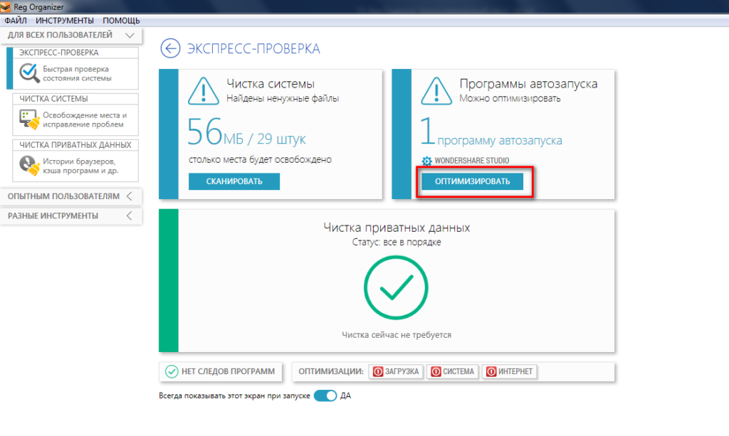 В Ускоритель Компьютера встроен удобный планировщик, который запустит УСК по расписанию в определенное время. Самостоятельно, без участия пользователя, софт выполнит проверку, не мешая работать на ПК. Можно не заботиться об оптимизации системы, она будет производиться регулярно. В Reg Organizer запуск очистки производится вручную. Ccleaner постоянно присутствует на панели задач, потребляет ресурсы системы, что нежелательно для маломощных машин.