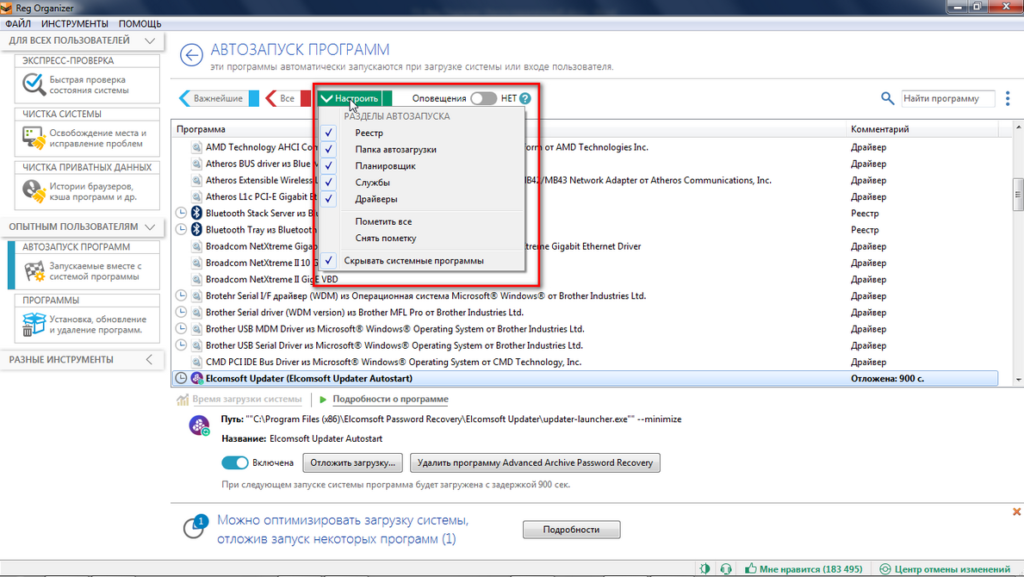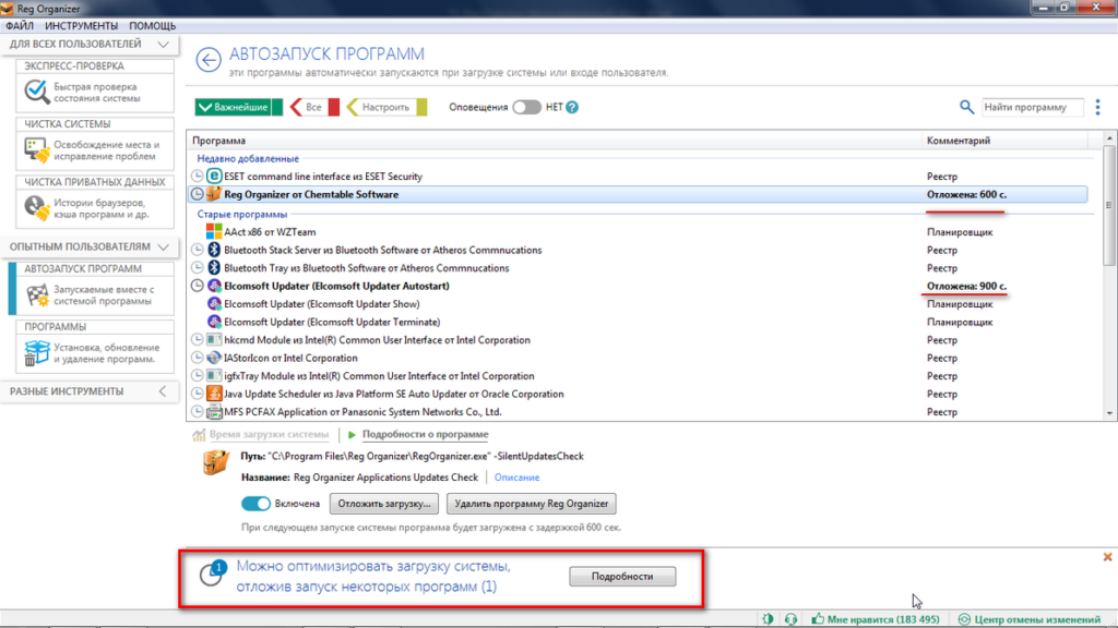 Автозапуск программ: в списке показаны все программы, запускаемые при запуске системы. Здесь вы можете удалить или отключить их, а также установить задержку, чтобы все программы не загружались одновременно и не замедляли работу всей системы.