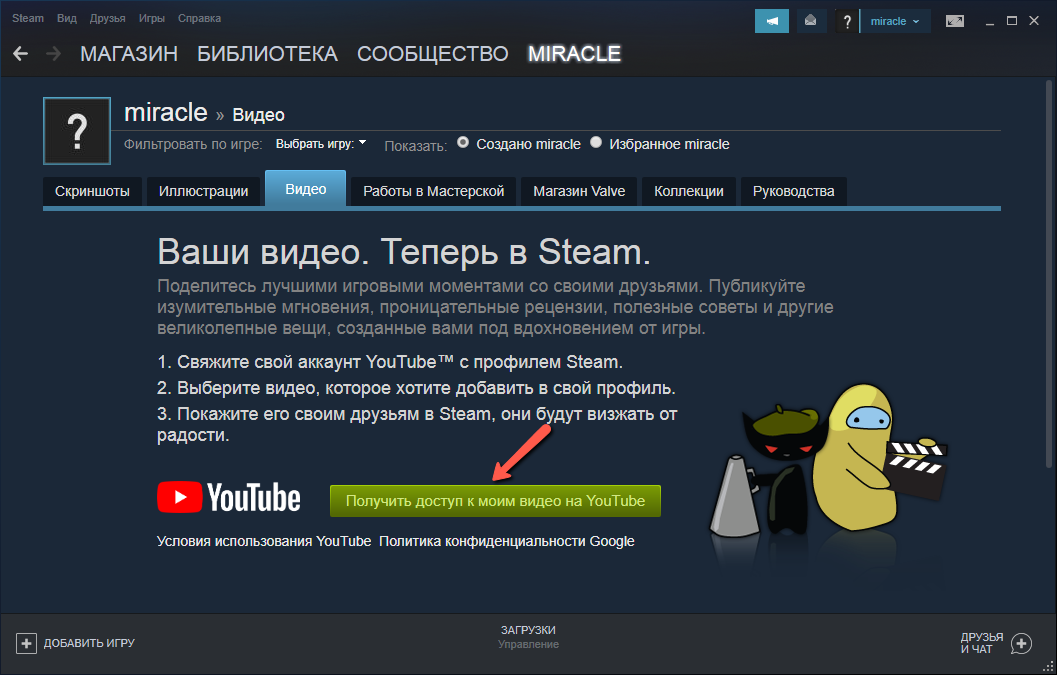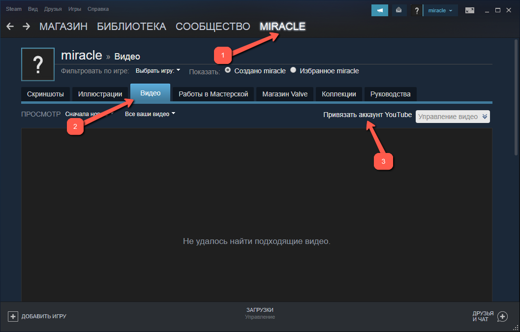 Для этого нужно открыть Steam, авторизоваться в профиле. Далее в меню, рядом с пунктом «Сообщество», нужно нажать на имя пользователя (1). Откроется меню, где владельцу аккаунта нужно выбрать строчку «Контент». В данном пункте есть вкладка «Видео» (2), а справа – ссылка «Привязать аккаунт YouTube» (3).