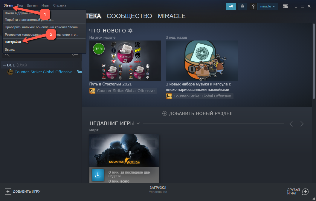 Если все ограничения сняты, то пора учиться запускать трансляцию! Для этого нужно открыть десктопный клиент онлайн-платформы Steam, авторизоваться в системе. Далее в меню выбрать пункт «Steam» (1), а в нём перейти в «Настройки» (2).