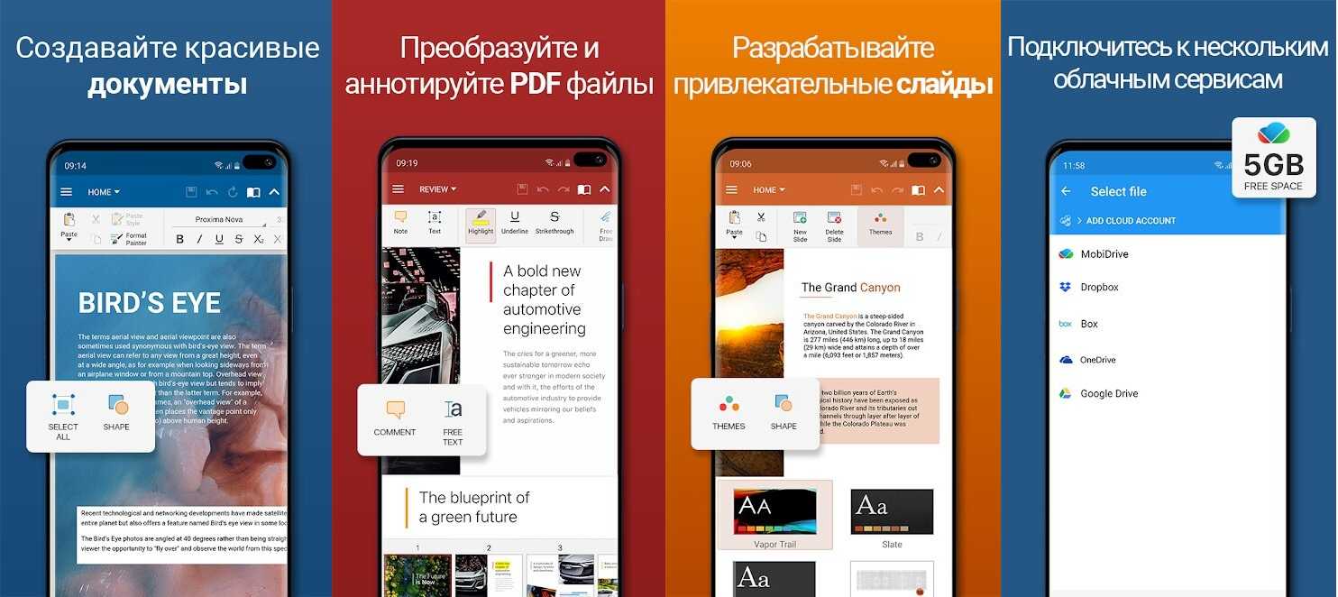 Этот софт для Android позволяет работать с ПДФ-документами, проектами Word и презентациями. Поддерживается как просмотр, так и редактирование.