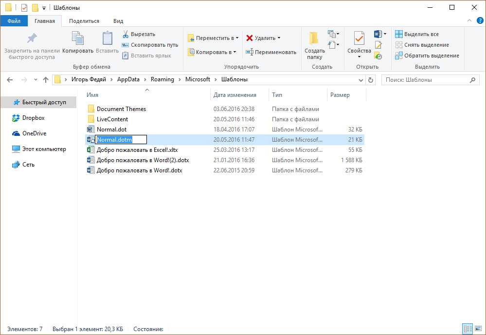 - Кликнуть правой кнопкой мышки по шаблону dotm, переименовать в Oldword.old.