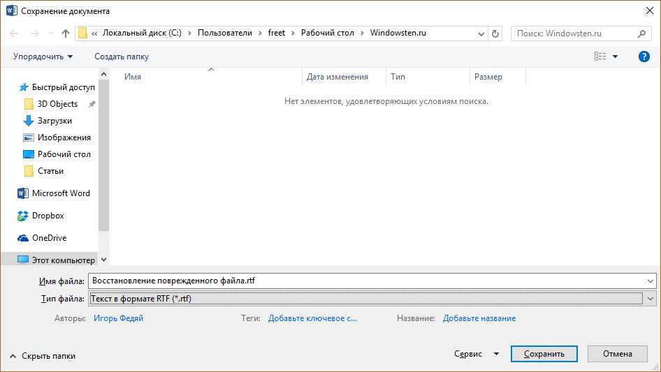 Далее проходим в «Файл—Сохранить как—Обзор» и при сохранении документа выбираем тип файла: «Текст в формате RTF».
