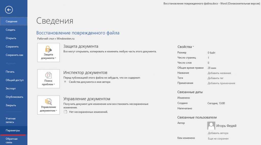 Запускаем текстовой редактор и заходим в «Файл—Параметры»