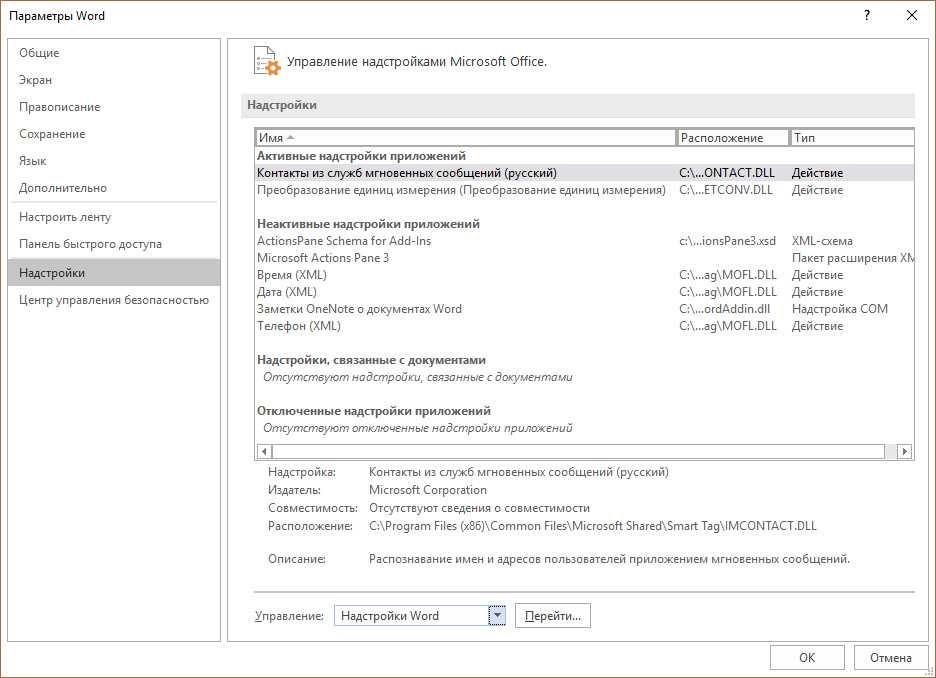 - Выбрать Надстройки, перейти через Управление в Надстройки Word (список внизу).