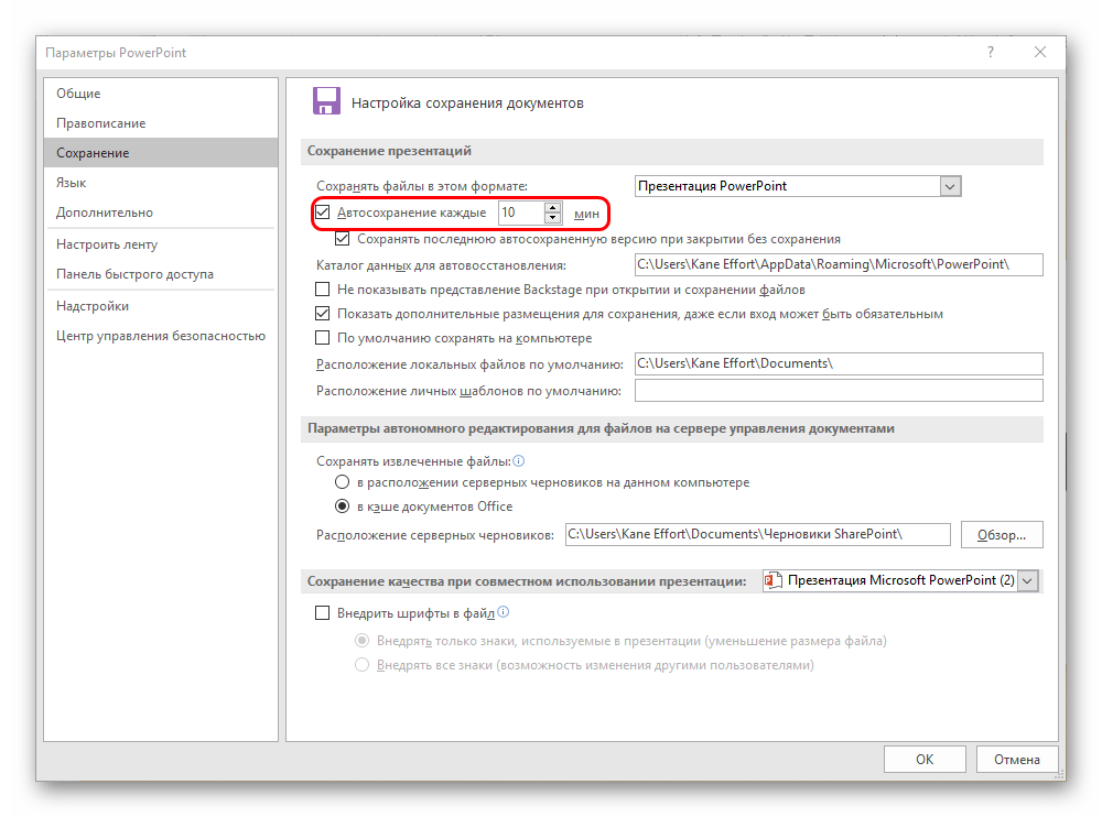 Автосохранение систематически производит автоматическое обновление готовой версии материального файла презентации. Да и любого файла Microsoft Office в принципе, функция не только в PowerPoint работает. В параметрах можно задать частоту срабатывания. По умолчанию интервал равен 10 минутам.