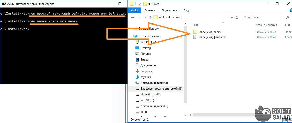 Переименование папки/файла — ren простой_текстовый_файл.txt новое_имя_файла.txt или ren папка новое_имя_папки. Переименуем созданный файл и папку.