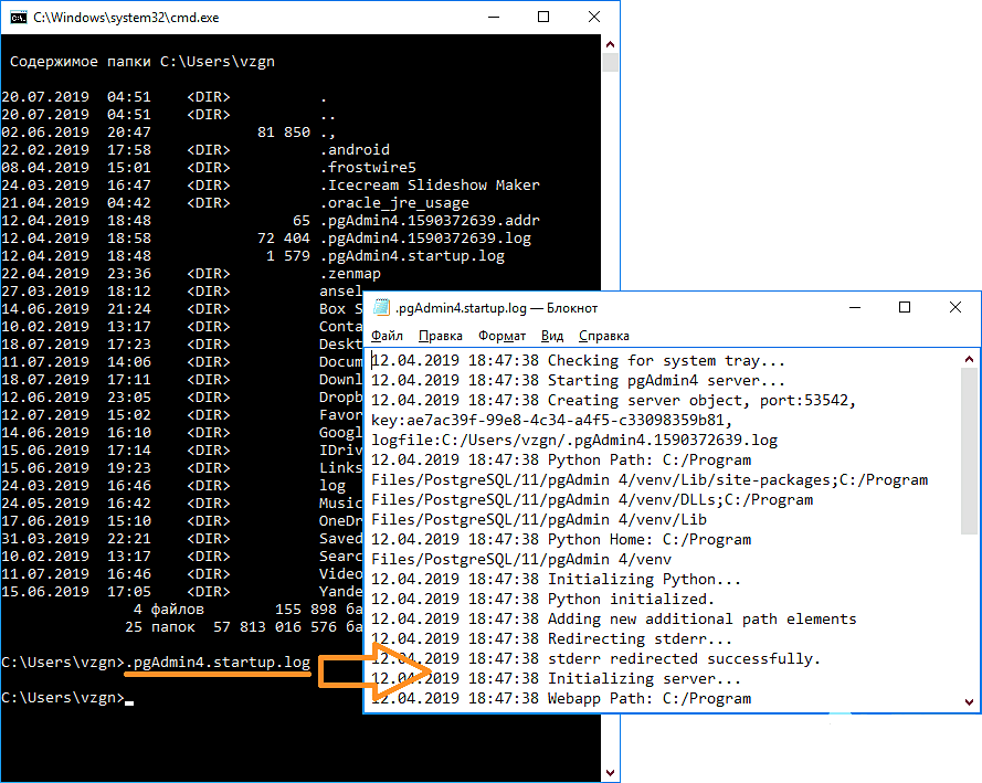 В нашем случае был открыт файл .pgAdmin4.startup.log при помощи «Блокнота». Если бы это был музыкальный файл, запустился бы аудиопроигрыватель, если DOC/DOCX-файл — редактор «MS Word» и т.д. Таким образом, открытие файла в командной строке равнозначно двойному клику по файлу в «Проводнике Windows».