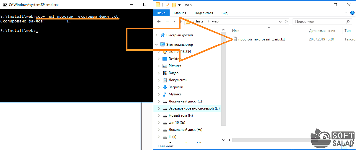 Создание простого текстового файла — copy nul простой_текстовый_файл.txt. Перед названием файла можно указать путь до конечной папки, в которой тот будет создан (если не указать, файл создастся в текущей папке).