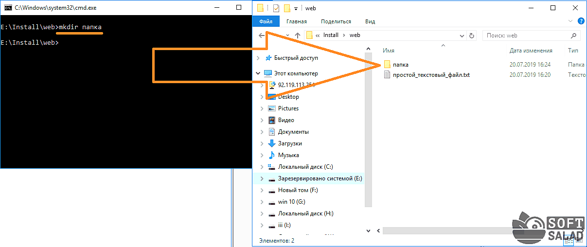 - Удаление папки — rmdir папка. Удаляем созданную ранее папку.