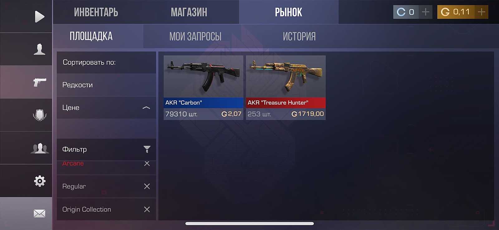 С балансом 0,5 голды и выше, переходим на рынок и выбираем следующие фильтры: AKR, Fable Collection, Origin Collection, Arcane, Uncommon, Regular.