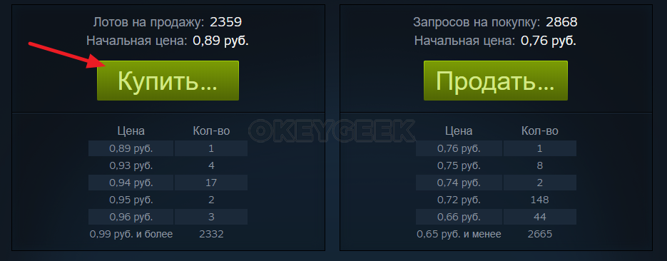Оказавшись на странице покупки конкретной карточки Steam, нажмите “Купить” около информации о стоимости карточки.