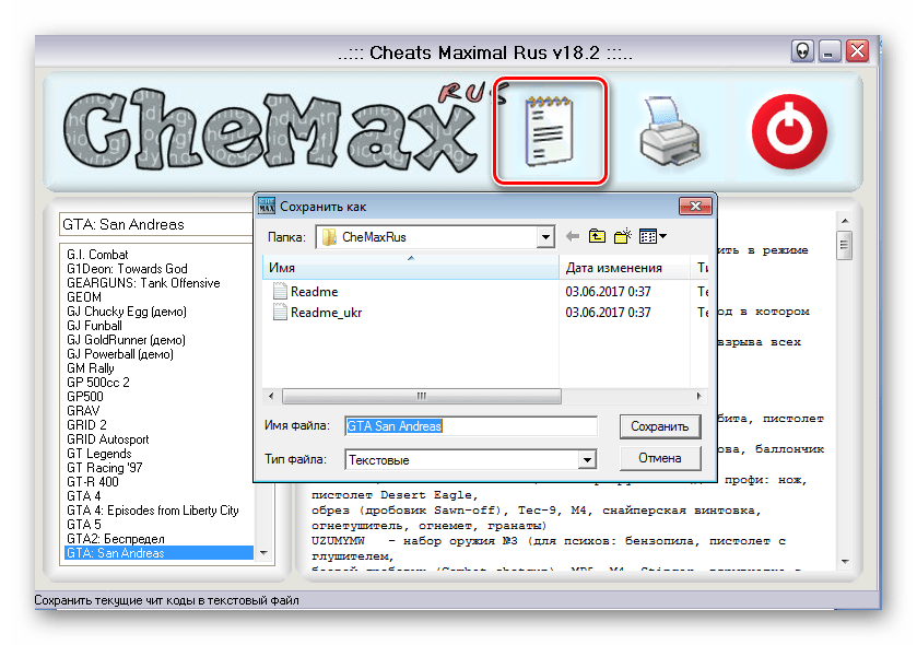 Далее вы можете получить текстовый вариант найденных кодов, чтобы их можно было сохранить или кому-нибудь отправить. Для этого просто нажмите на значок в виде блокнота, чтобы сохранить текстовую версию текущих чит-кодов.