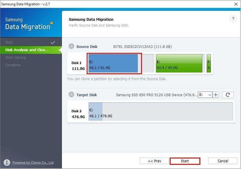 2. You’ll see the source disk, i.e. the existing disk which contains the operating system and the Samsung SSD. Pitch on C drive only. You’ll see only C drive on the Samsung SSD in virtual states. Click Start again to continue.