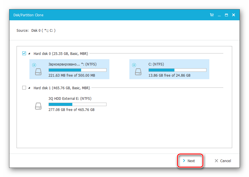 - В открывшемся окне нажмите «Next» (Далее), а на следующем экране выберите тот диск, с которого будет выполняться перенос Windows. Нажмите «Next».
