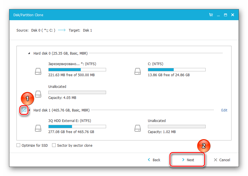 В открывшемся окне поставьте галочку рядом с тем диском, с которого нужно произвести клонирование. Вместе с этим автоматически будут выбраны все разделы.