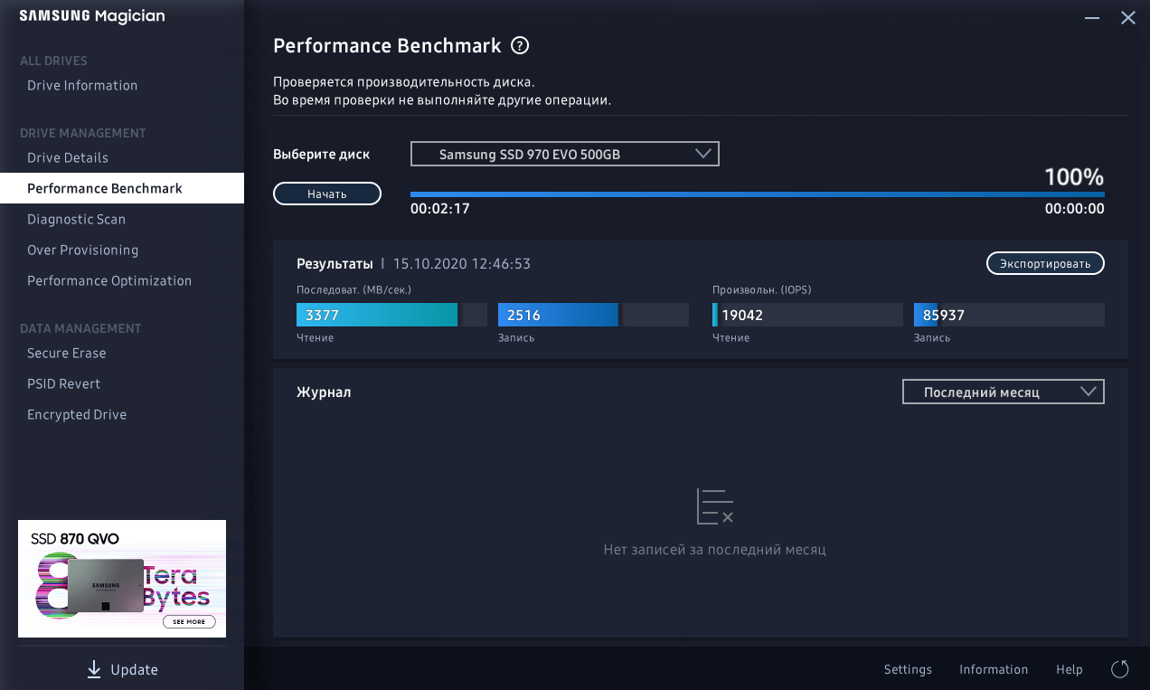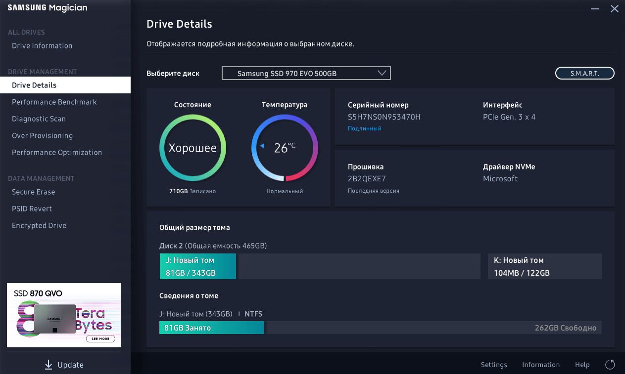 Если вы являетесь счастливым обладателем твердотельного накопителя от компании Samsung, то для диагностики и информации о нём предлагаю скачать утилиту Samsung SSD Magician Tool