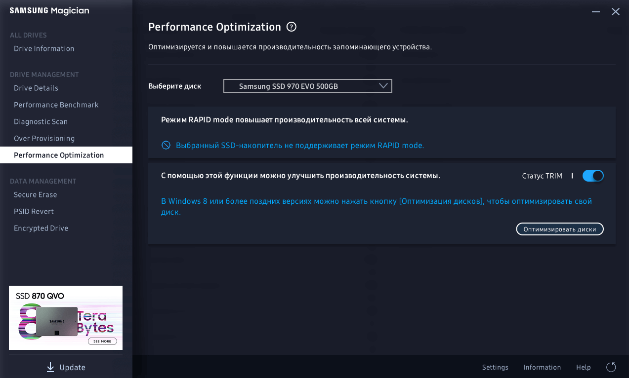 Эта система дает возможность периодически обновлять firmware твердотельных накопителей. Также с его помощью можно отслеживать свободного места на дисковом пространстве, оптимизировать работу операционки для работы с хранилищем, фиксировать скорость его работы. И это лишь основная часть предлагаемых функций.