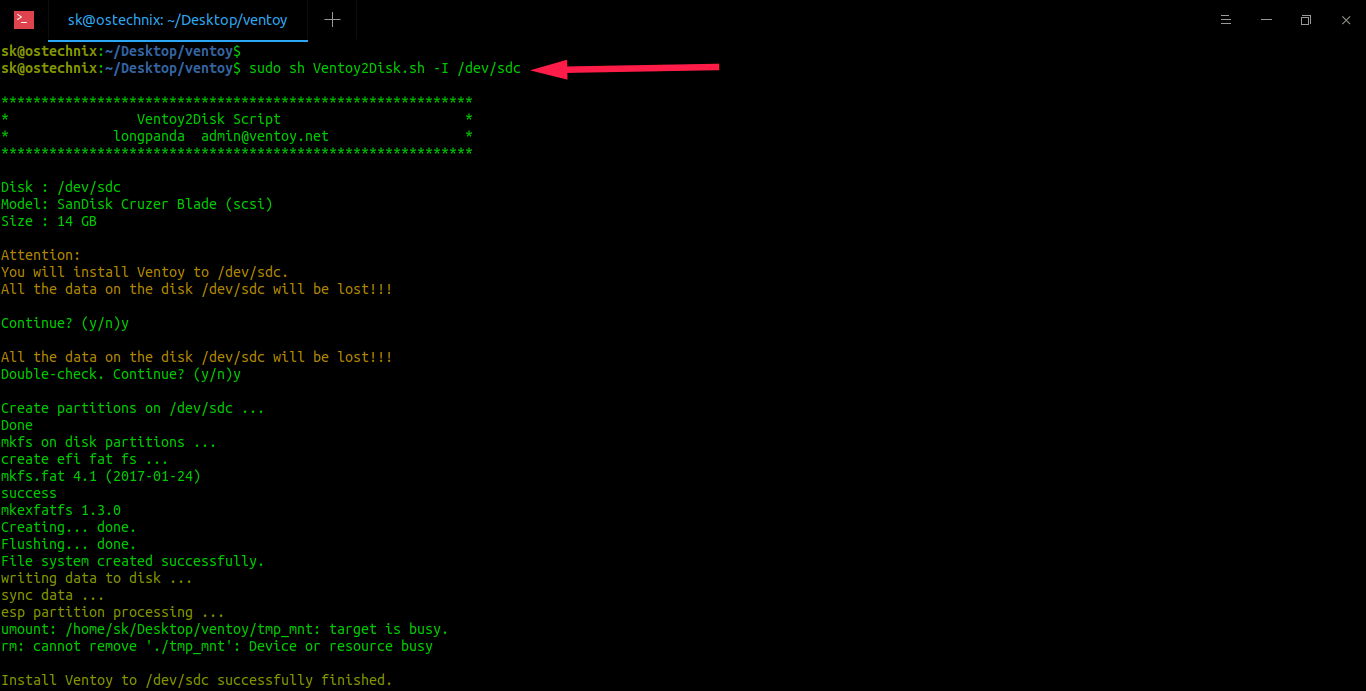 Теперь запустите следующую команду, чтобы создать мульти-загрузочный USB-диск: