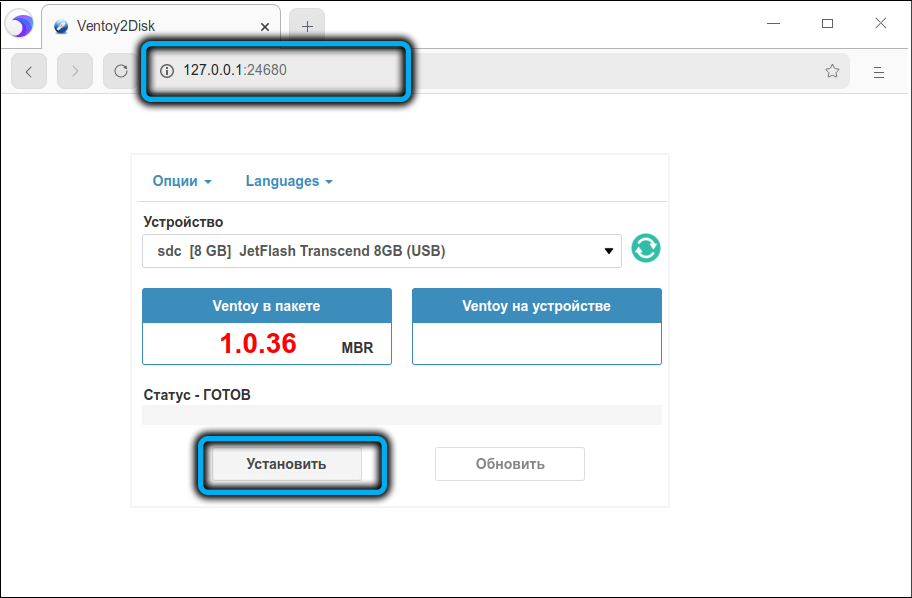 Для установки Ventoy выбираем нужную флешку во вкладке “Device” и нажимаем “Установить”. Появится несколько предупреждений о том, что все данные с флешки будут удалены. Соглашаемся и ожидаем окончания установки.