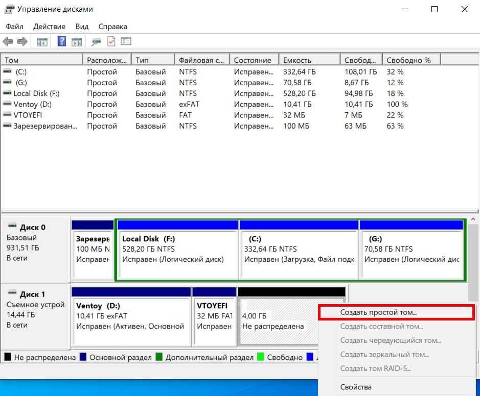 Для создания раздела наводим курсор на меню пуск, нажимаем правую кнопку мыши и выбираем “Управление дисками”. В нижней части окна находим неразмеченную область на USB носителе, нажимаем правую кнопку и выбираем “Создать простой том”. Раздел готов и можно скопировать в него драйвера или любую другую полезную информацию.