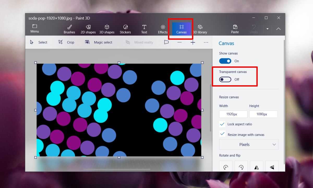 Откройте изображение в Paint 3D. Вверху вы увидите несколько элементов управления. Выберите холст. Справа откроется панель. На этой панели включите переключатель «Прозрачный холст».
