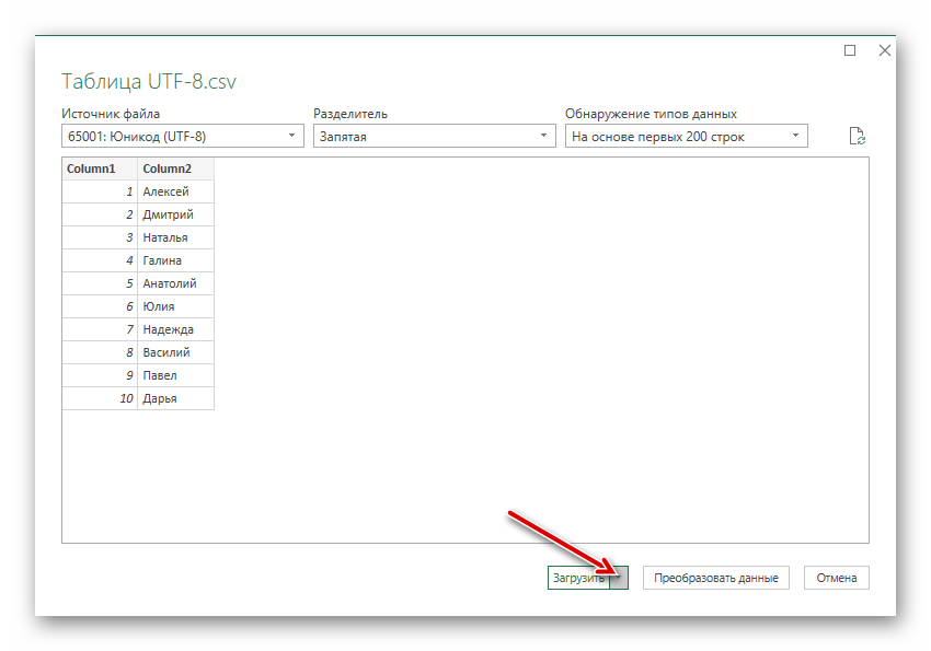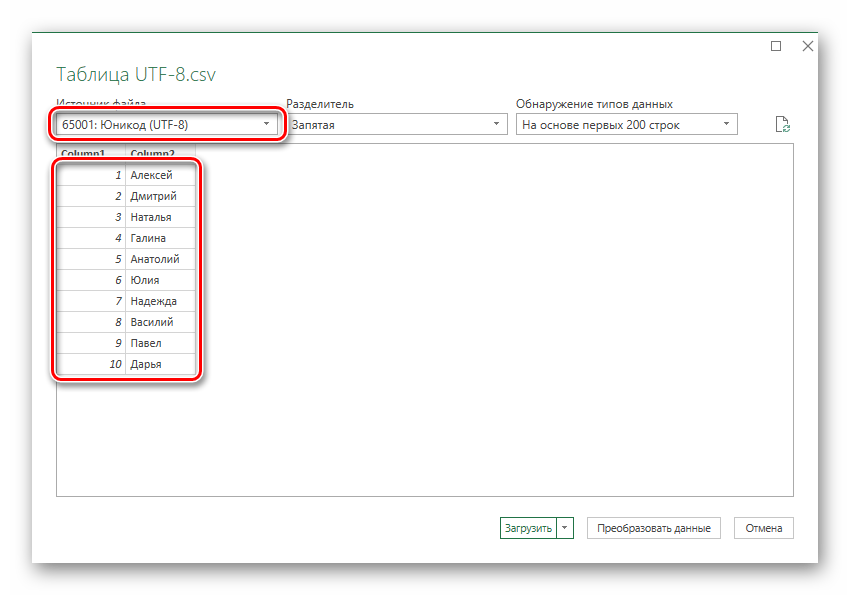 Откроется окно настройки. Здесь необходимо выбрать кодировку, которую использует файл. В нашем примере это «Юникод (UTF-8)» — данный пункт находится почти в самом низу. Предварительный просмотр таблицы должен отображаться корректно.