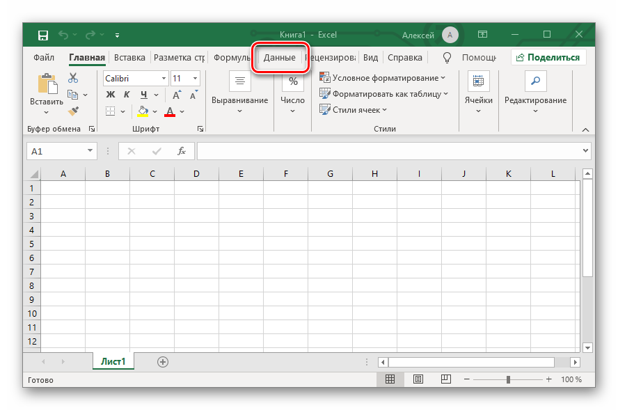 Создаём пустую книгу в Excel и переходим во вкладку «Данные».