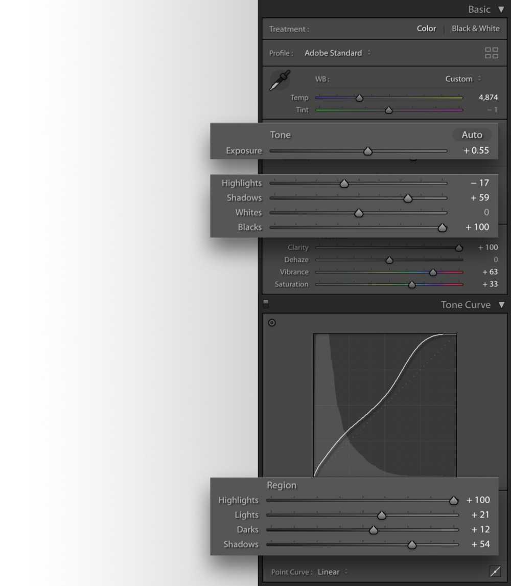 Более детально скорректировать свет помогут аналогичные ползунки в секции Tone Curve (Тоновая Кривая).
