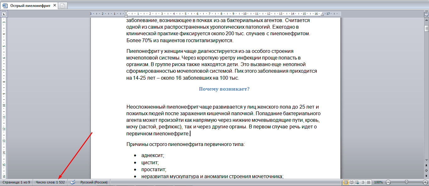 Можно сделать еще проще: кликнуть мышкой на строку, которая расположена под страницей с текстом. Как правило, такая область есть и в ней написано: «число слов: и указано количество.