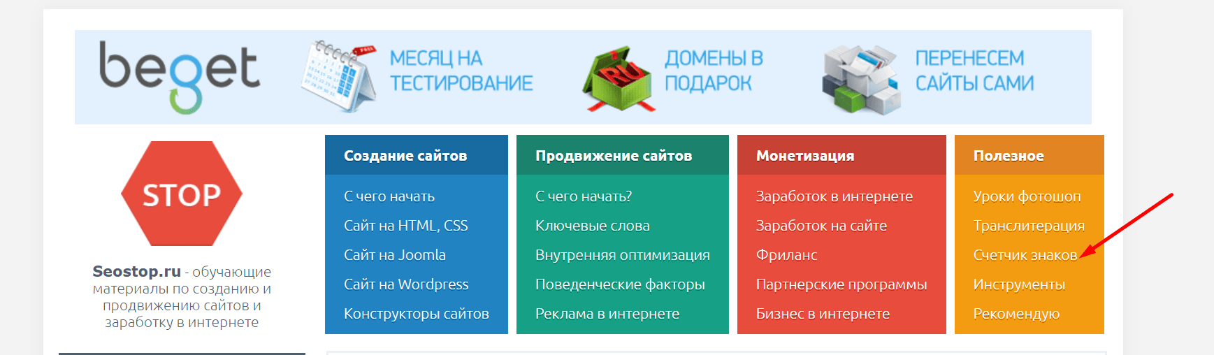 На сайте в разделе “Полезное” находим “Счетчик знаков”. Идем туда.