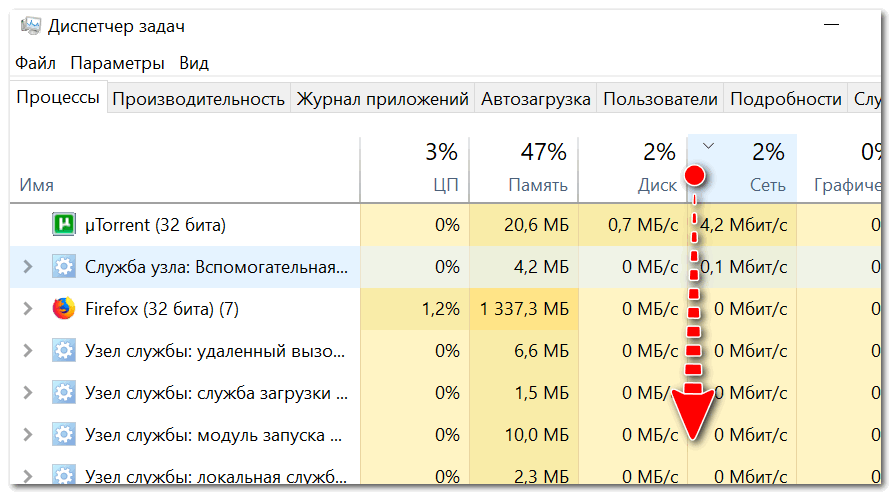 Обратите внимание в первую очередь на те приложения, которые нагружают сеть более 5%: торрент-программы, браузеры, и пр