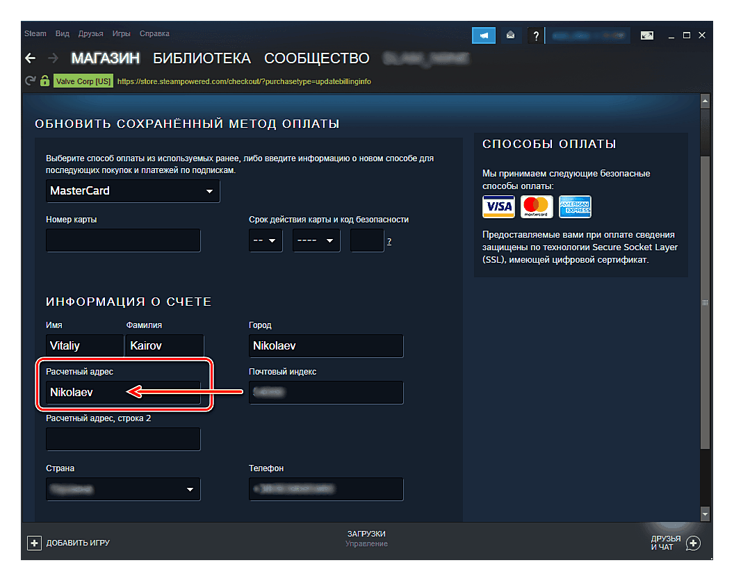 И все же банковские карты, как таковые, не теряют свою актуальность – ими продолжает пользоваться большое число активных и не очень пользователей Стим. При этом у новичков возникают вопросы по поводу подключения такого способа оплаты к Steam. Одним из наиболее частых является следующий: «Что такое расчетный адрес в Steam?» Возникает он непосредственно в процессе добавления и/или обновления метода оплаты, и сам термин «Расчетный адрес» является наименее очевидным и наиболее непонятным из всех, представленных в следующей форме: