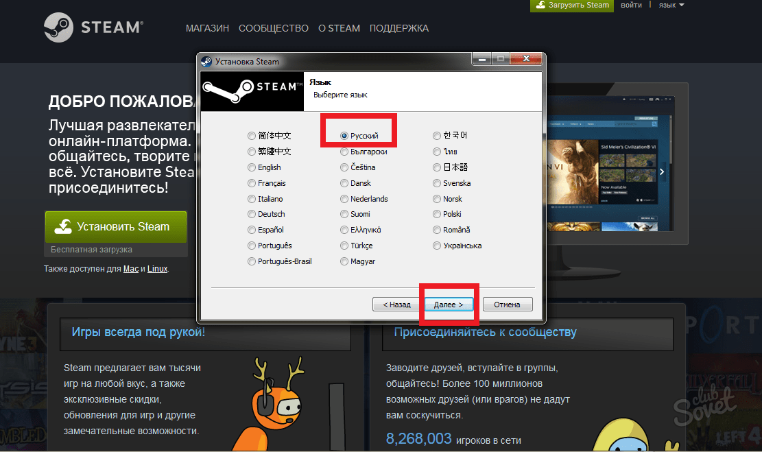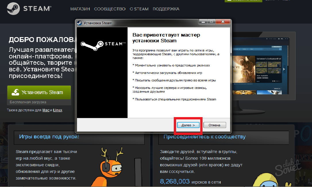 Если ваша ОС – Windows, то нажмите “Установить Steam” в появившемся окне