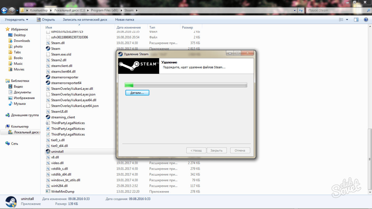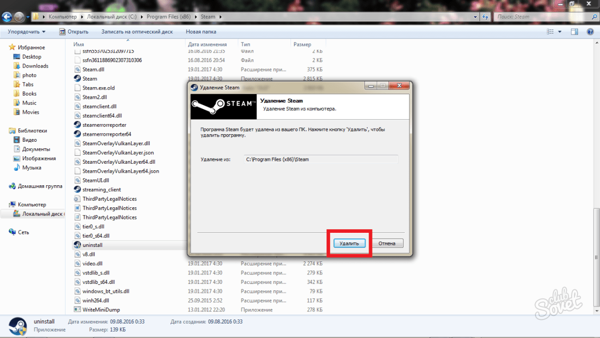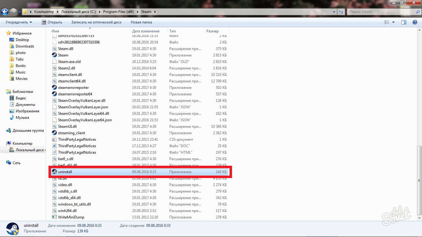 Если же у вас не запустился файл Uninstall.exe, либо клиент попросил вставить диск, то вам подойдёт следующий вариант переустановки Стима.