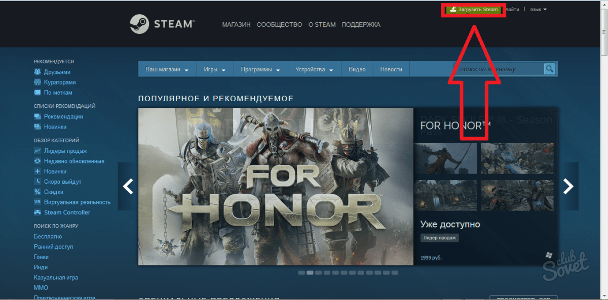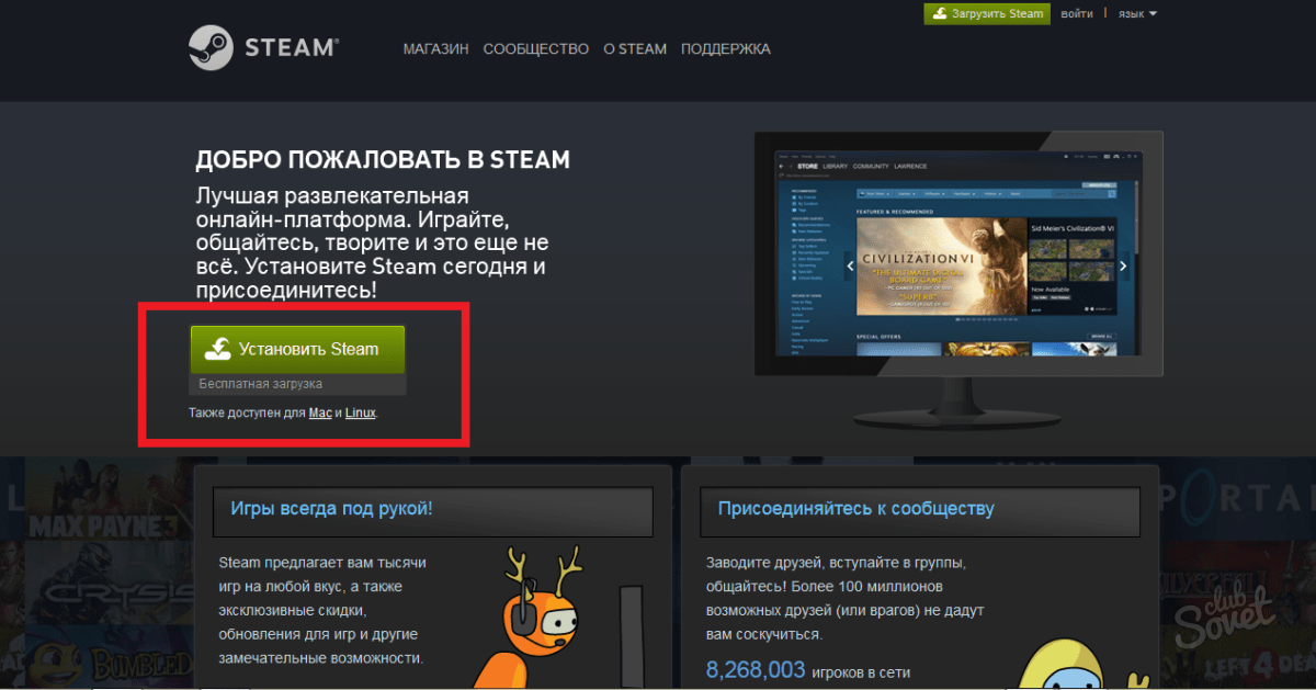 Таким образом, вы удалили все файлы клиента со своего компьютера. Теперь вам нужно скачать его заново с официального сайта Valve: http://steampowered.com. Кликните “Загрузить steam” в самом верхнем правом углу экрана.