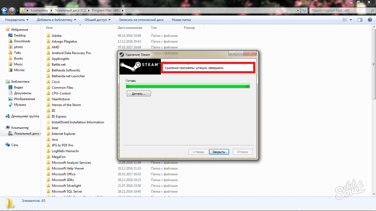 После завершения, в окне появится фраза “Удаление программы успешно завершено”.