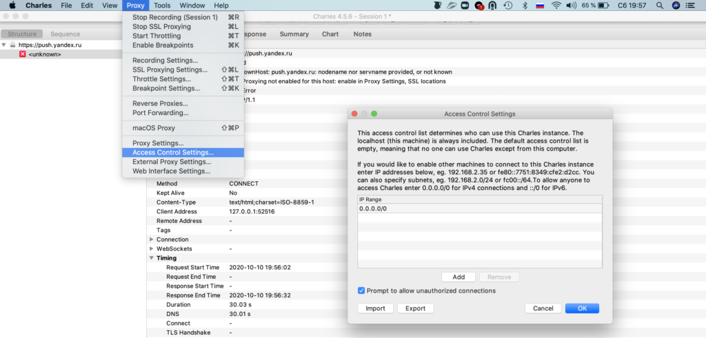 При первом запуске Charles скорее всего попросит разрешения внести изменения в сетевые настройки вашего компьютера, согласитесь.