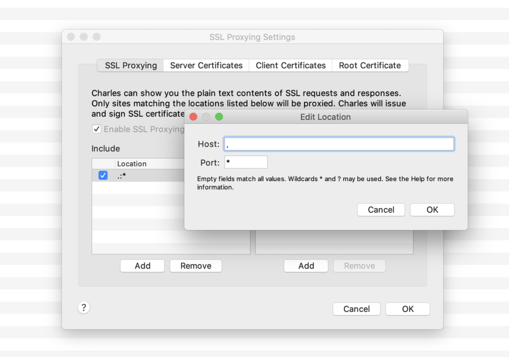 Затем перейдите в Proxy – SSL Proxying Settings, установите галочку в Enable SSL Proxying, нажмите кнопку Add и добавьте локацию, в Host укажите «.», а в Port «*». Такая настройка позволит получать запросы и ответы со всех хостов. Или вы можете добавить только интересующие.