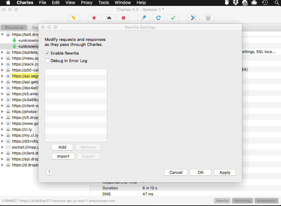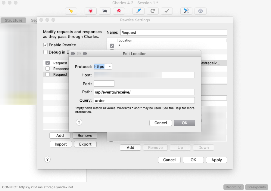 Итак, запросы к нужному серверу для нас теперь абсолютно прозрачны, но Charles интересен не только возможностью мониторинга запросов, но и возможностью их модификации. Например, можно изменить какой-либо параметр в заголовке или в теле запроса и посмотреть что вернёт нам сервер, или же наоборот, отправить правильный запрос, но модифицировать ответ, чтобы проверить ситуации, когда сервер может возвращать некорректные данные или когда нужно показать лишь часть данных. Сейчас нас интересует инструмент Rewrite: