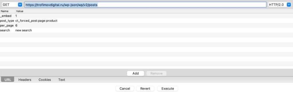 В открывшемся окне можно изменить тело запроса, метод, протокол, url, параметры, заголовки и куки. Затем нужно нажать кнопку Execute и запрос будет отправлен с новыми данными.