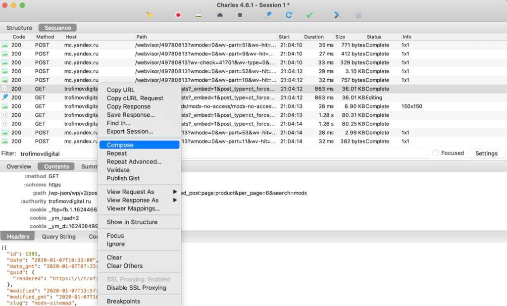 Все готово! Возвращаемся обратно в Charles и во вкладке Sequence видим дивную картину: