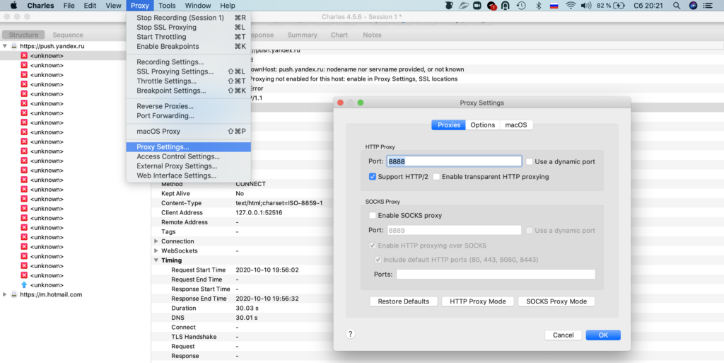 Укажите порт: Proxy – Proxy Settings – вкладка Proxies – Port: 8888.